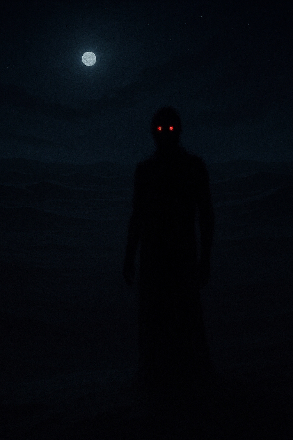 At fifty meters, the figure stopped again. Now I could see it more clearly. It wasn’t just a shadow—it was darkness given form. The edges of its silhouette wavered like smoke against the moonlit sand, but maintained a roughly human shape. No features were visible except those glowing crimson points.